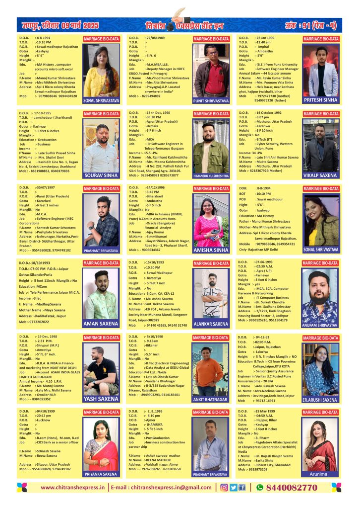 • आप उक्त सभी जानकारी समाज़ में निःशुल्क देने के लिए मोबाइल नंबर 8440082770 पर व्हाट्सएप या ईमेल chitranshexpress.in@gmail.com पर भेज सकते हैं।